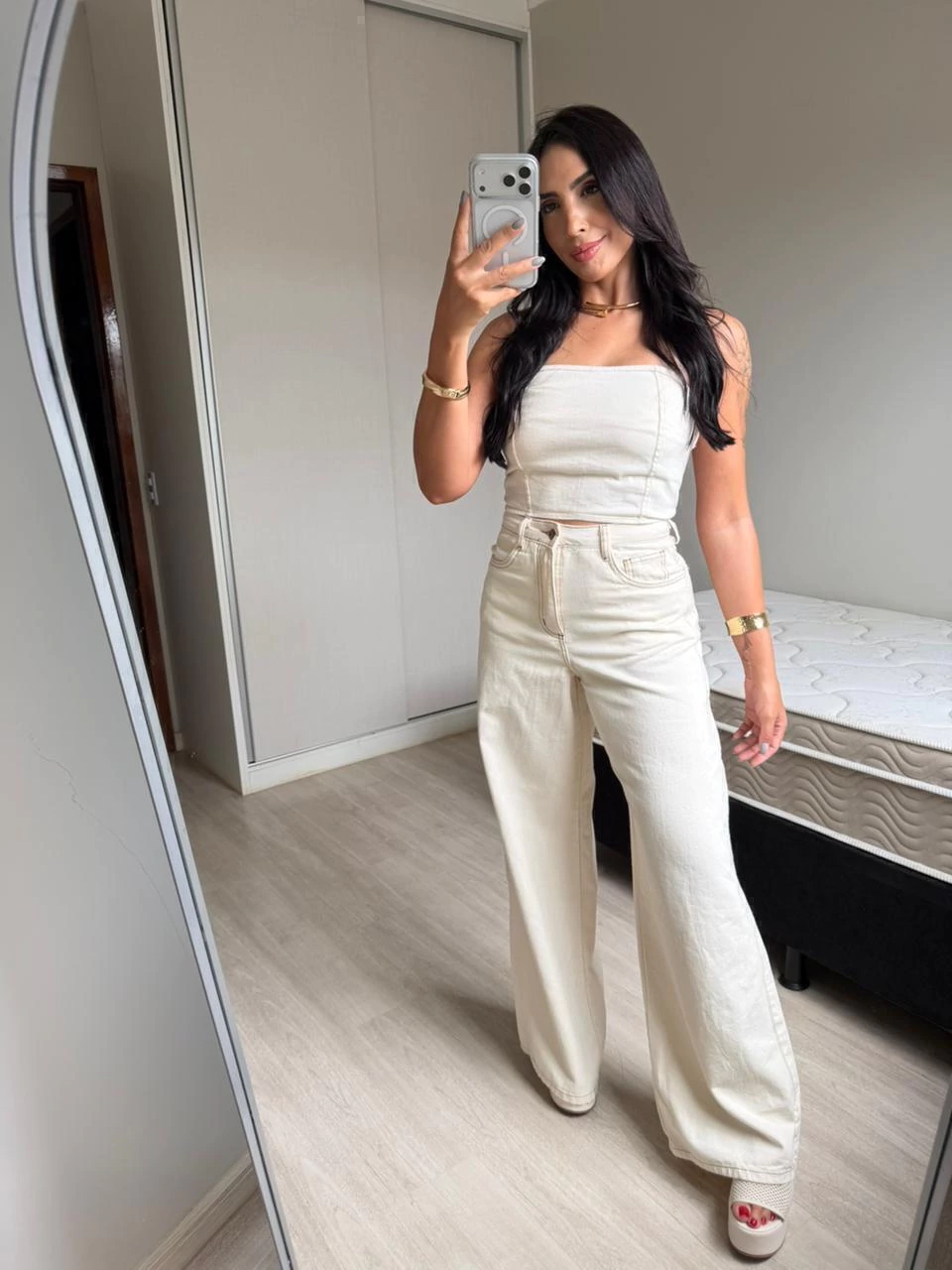 Composto por calça pantalona de cintura alta + cropped ajustavel ao corpo.
